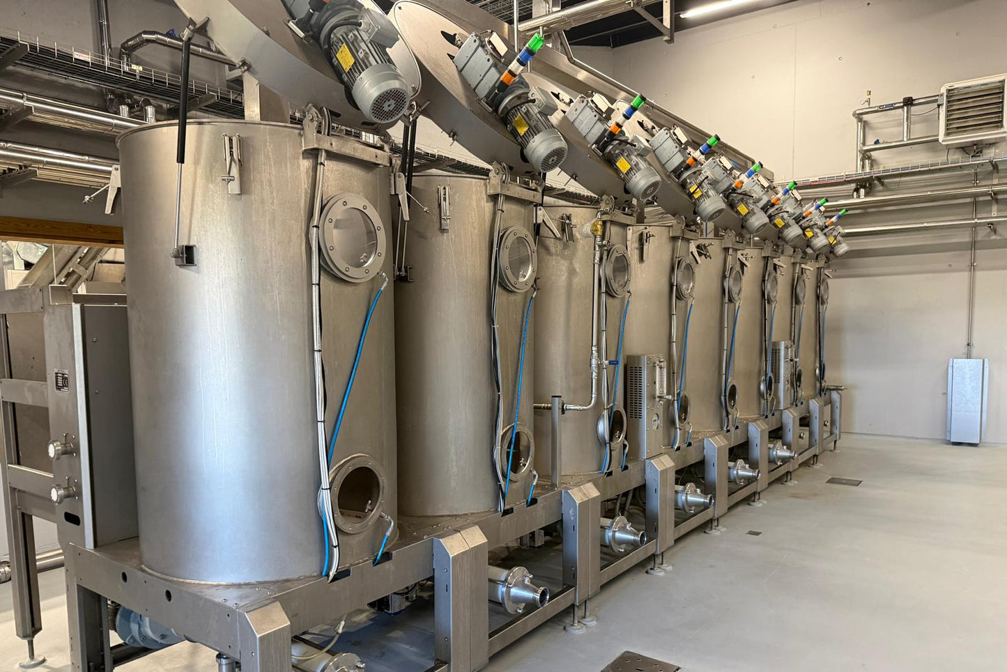 Malaxing is the process in which the pulp is massaged/kneaded in order to homogenise the oil droplets so they come together forming larger droplets, essential for the following extraction process. The olive paste is first processed using an innovative airtight vertical malaxing system with 8 mixers, each holding 800 kg of paste, these are designed to minimise oxygen exposure and allow for very short malaxing times (under 15 minutes), which helps preserve and concentrate the oil’s aromas. Thermal jackets enable precise control of paste temperature, kept consistently at 26 °C as with the milling.